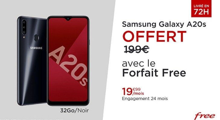 Interrogé par Univers Freebox, Free nous indique que l’offre Forfait Free avec Samsung Galaxy A20S offert, se terminera ce mardi 3 novembre à 6h00. Ce forfait Free Veepee est proposé au tarif habituel, soit 19,99 euros par mois ou 15,99 euros par mois pour les abonnés Freebox, avec un engagement de 24 mois. En passant commande sur le site de e-commerce, vous recevrez gratuitement un Samsung Galaxy A20S 32 Go noir, un smartphone d’une valeur de 199 euros proposant notamment un écran 6,5 pouces HD+ avec encoche goutte d’eau, un triple capteur photo 13/8/5 Mégapixels, une batterie 4 000 mAh et un chipset Snapdragon 450 avec 3 Go de RAM. L’offre inclut par ailleurs le service Free Ligue 1 Uber Eats.
