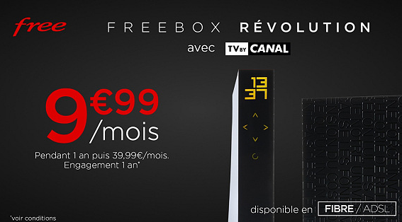 – Forfait Freebox Révolution avec TV by CANAL, avec offre promotionnelle Veepee à 9,99€/mois pendant 1 an (dans la limite de 12 mensualités au tarif promotionnel), puis 39,99€/mois.